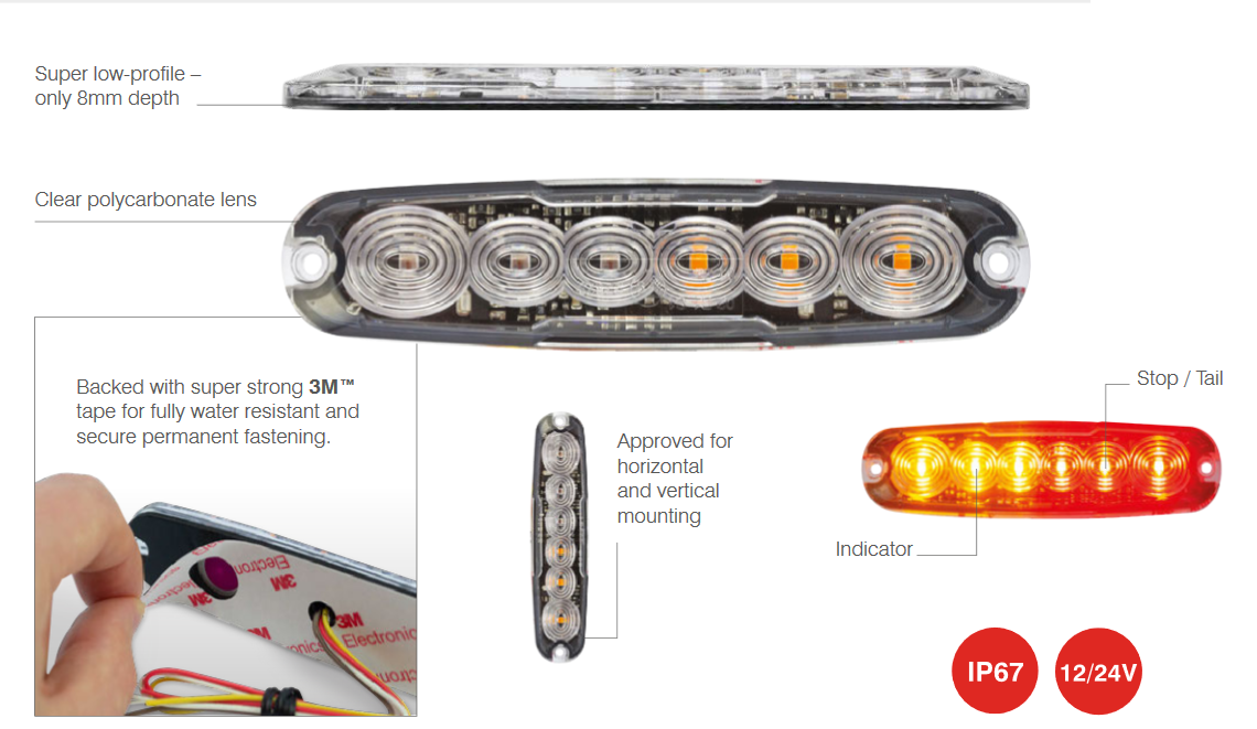 Als Flachprofil-Aufbauleuchte mit nur 8mm Höhe und nur 131mm Länge ist die Serie 12 eine der kleinsten ECE geprüften Rückleuchten im Markt und besonders geeignet für die Montage mit geringem Platz.